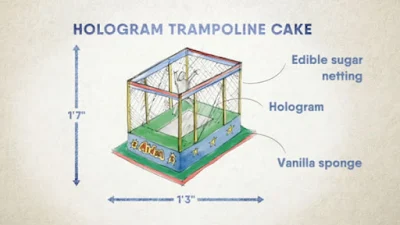 Michelle created 3D hologram cake using iPad and acrylic perspex sheet for 8 years old Aidan who is a trampoline champion. Check out the video below from Season 2 Episode 21 Extreme Cake Makers.